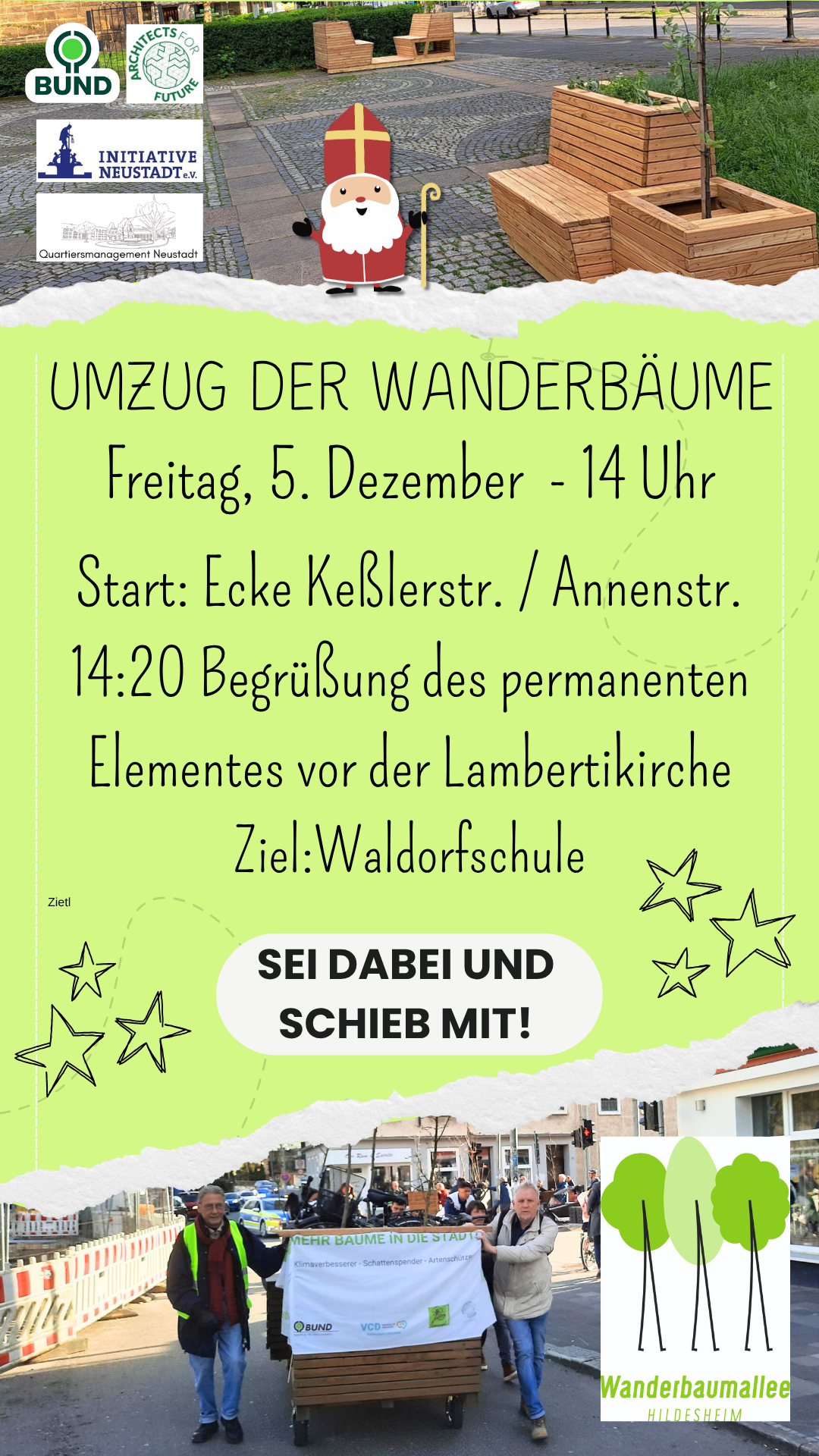 Ecke Keßlerstraße / Annenstraße Keßlerstraße 35, HildesheimAm 5.12. findet der Umzug der Wanderbaumelemente in das Winterquartier statt. Start ist um 14 Uhr an der Ecke Keßlerstr. / Annenstr. . Eines der Elemente findet einen permanenten Platz vor der Lambertikirche an der Goschenstraße. Es gibt dort um ca. 14:20 eine kleine Begrüßung von Pastor Peter Noß-Kolbe und der Initiative Neustadt, bevor es […]